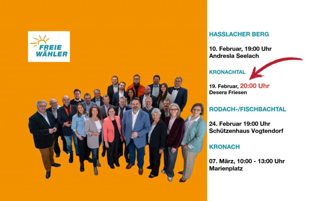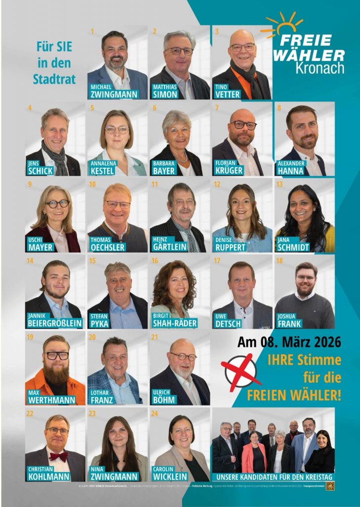 Am 08. März steht die Kommunalwahl an. Gemeinsam mit mir als Bürgermeisterkandidat und einem engagierten Team von Stadtratskandidatinnen und -kandidaten möchten wir Kronach aktiv weiterentwickeln und die Zukunft unserer Heimat mit Ihnen gestalten.